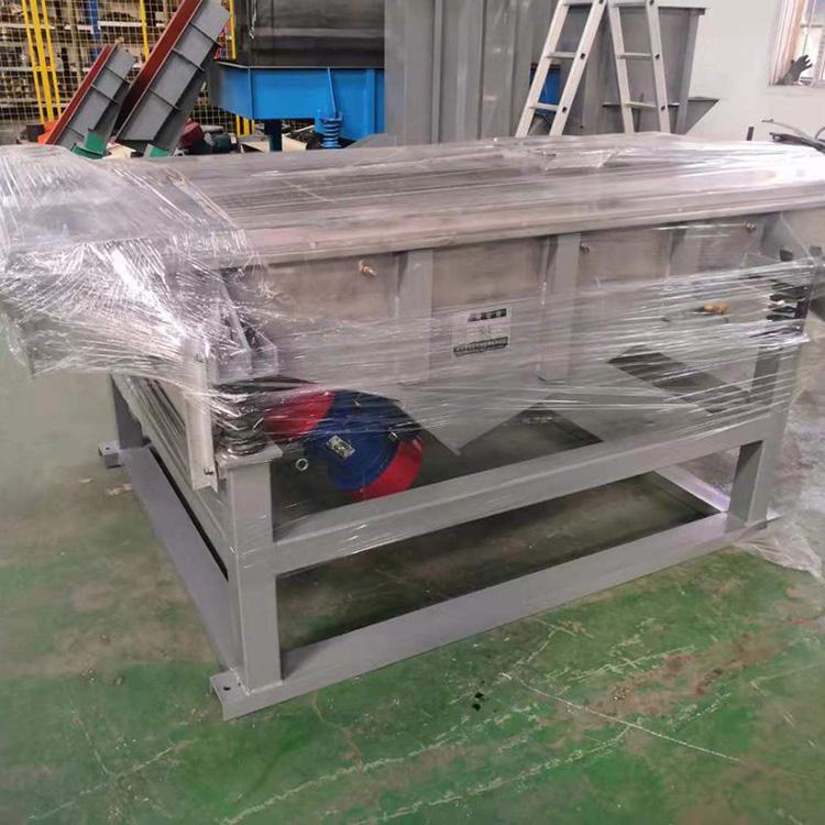 直線振動篩采用雙振動電機驅動,當兩臺振動電機做同步、反向旋轉時,其偏心塊所產生的激振力在平行于電機軸線的方向相互抵消,在垂直于電機軸的方向疊為一合力,因此篩機的運動軌跡為一直線。其兩電機軸相對篩面有一傾角,在激振力和物料自重力的合力作用下,物料在篩面上被拋起跳躍式向前作直線運動,從而達到對物料進行篩選和分級的目的??捎糜诹魉€中實現自動化作業。具有能耗低、結構簡單、易維修、全封閉結構無粉塵溢散的特點。篩分目數400目,可篩分出7種不同粒度的物料。