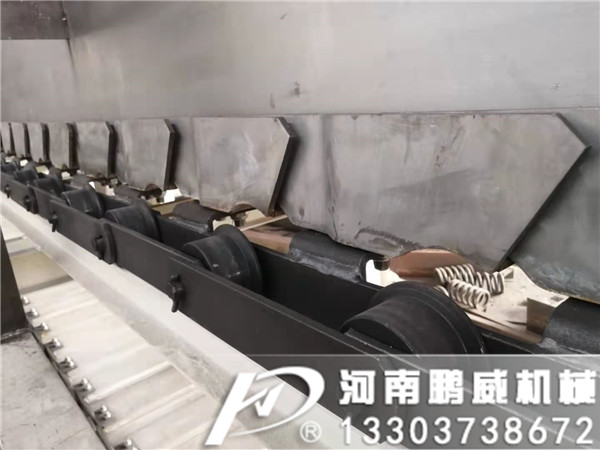 5、輸送能力大:特別是鱗板板式輸送機(一般稱為雙鏈有擋邊波浪型板式輸送機)的生產能力可高達1000t/h。